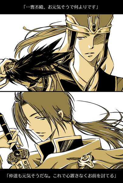 「無双OROCHI」より主従邂逅場面。 三国×戦国とかww と当初はdisり気味だった私の心をまんまと鷲掴んでくれた問題のシーンです(笑) (情報聞いてソッコーぽちった) 曹丕はいつもの調子でうっすら笑みとか浮かべつつ、 司馬懿は一見平静で声も口調も冷厳だけど 目元とか微妙に苦し気だったりするといい、と思います。