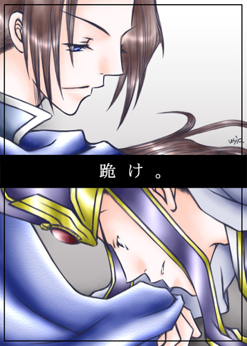 「曹丕様受け60のお題」第1弾。 「跪け」は曹丕様の名台詞ですが内心、司馬懿の方も 同じ心地があるのかも…と云う事でこんな構図です。 いつか相手を真実屈服させたいと二人とも思ってそう。 お互いの相容れない本心を充分知っているのに表面上だけは 形式的な礼が過剰なまでに遵守されてる関係とか、萌える。