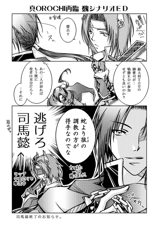 三成の扇は携帯用の小さいやつなんだよきっと!←今思いついた言い訳そんな訳でEDとか全然出番なかったですけど orz三丕はきっと同じ魏陣営で頑張ってたと思いたいそんな乙女心。で、曹丕がムービー参加しなかったのは司馬懿を直々にボコり躾け直していたからに違いない。もう半殺しと云わず、いっそ8割くらい逝ってたとしても構わないので←お願いですからハグレ司馬懿をちゃんと魏まで連れ帰ってあげて下さい、曹丕様(笑)